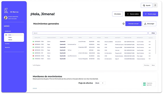 Desde aquí se puede: consultar movimientos en tiempo real, aplicar filtros por fecha, categoría o monto, exportar reportes, descargar comprobantes y generar referencias de depósito. Esta funcionalidad es clave para la operación diaria de la empresa y se adapta tanto a modelos simples como a operaciones multi-cuenta.